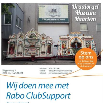 Ook dit jaar doet Draaiorgelmuseum Haarlem weer mee aan de actie Rabo ClubSupport waarbij leden van de Rabobank Haarlem – IJmond van 1 t/m 23 September kunnen stemmen op een deelnemer die zij graag gesponsord zien worden. Heeft u familie, vrienden of kennissen die lid zijn van Rabobank in deze regio, wilt u Draaiorgelmuseum Haarlem dan bij hen onder de aandacht brengen?